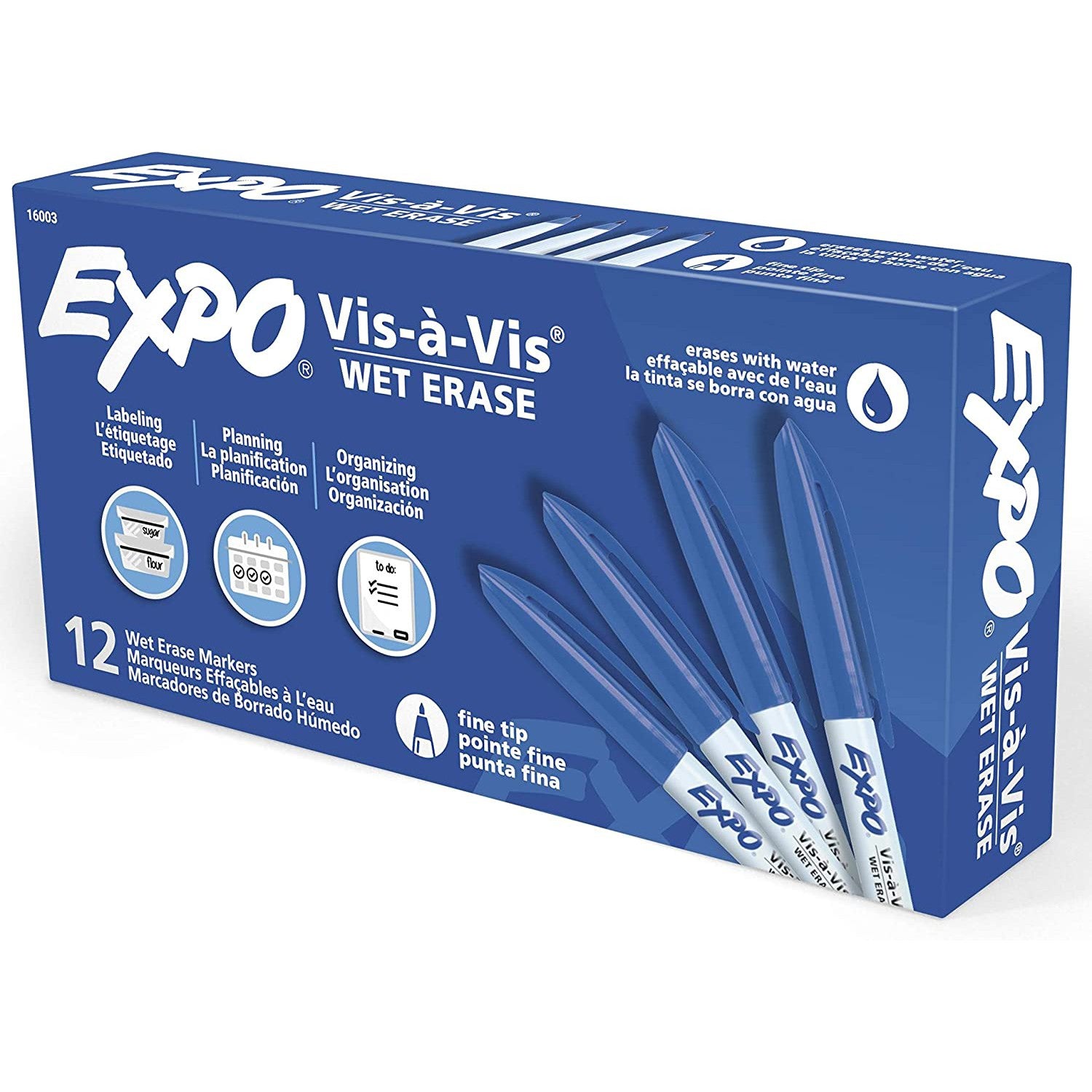 Expo Vis-A-Vis Wet Erase Markers, Fine Point, Blue, 12 Count
